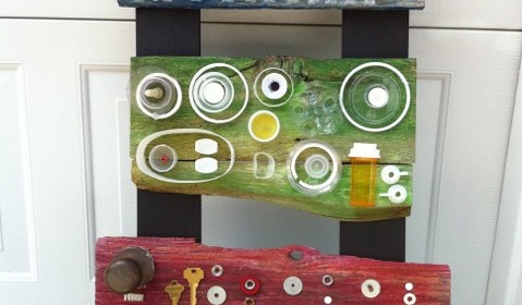 - Odd Birds II, found plastic & paint, 9″ x 9″
