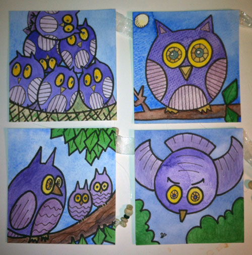 - Owls, ATC, 4″ x 4″, wc & ink