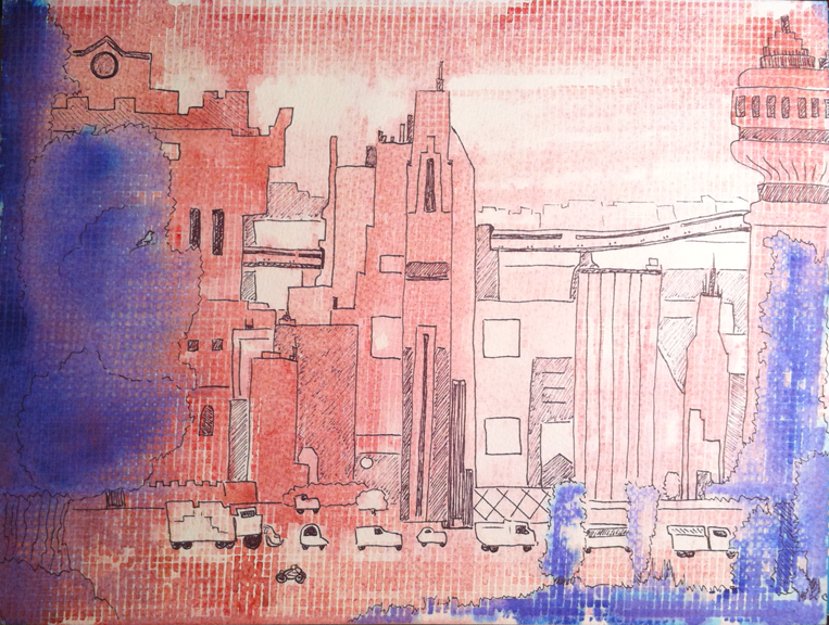 - Cityscape, 10″ x 14″, ink